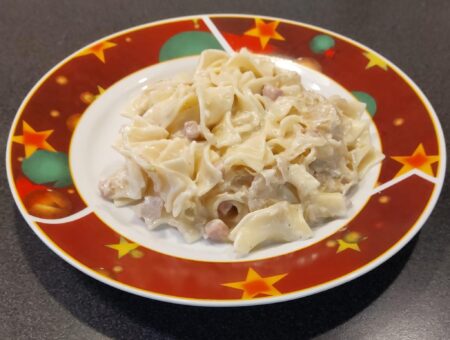 Kochen: Bandnudeln nach Packungsanweisung kochen. Kurz vor Ende etwas Nudelwasser abschöpfen und beiseite stellen.