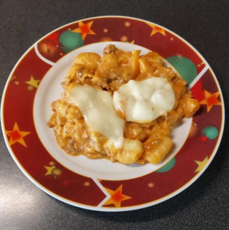 Im vorgeheizten Ofen ca. 10–15 Minuten überbacken, bis der Käse goldbraun geschmolzen ist.