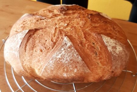 Kartoffeln kochen, abkühlen lassen und durch eine Presse drücken. Wasser und restlichen Zutaten hinzufügen und alles gut verkneten. Nun zu drei Baguettes formen und etwa 30 Minuten gehen lassen. Die Baguettes einschneiden, in den vorgeheizten Backofen bei 230° etwa 10 Minuten backen, dann auf 210° runterschalten und weitere 15 Minuten fertig backen.